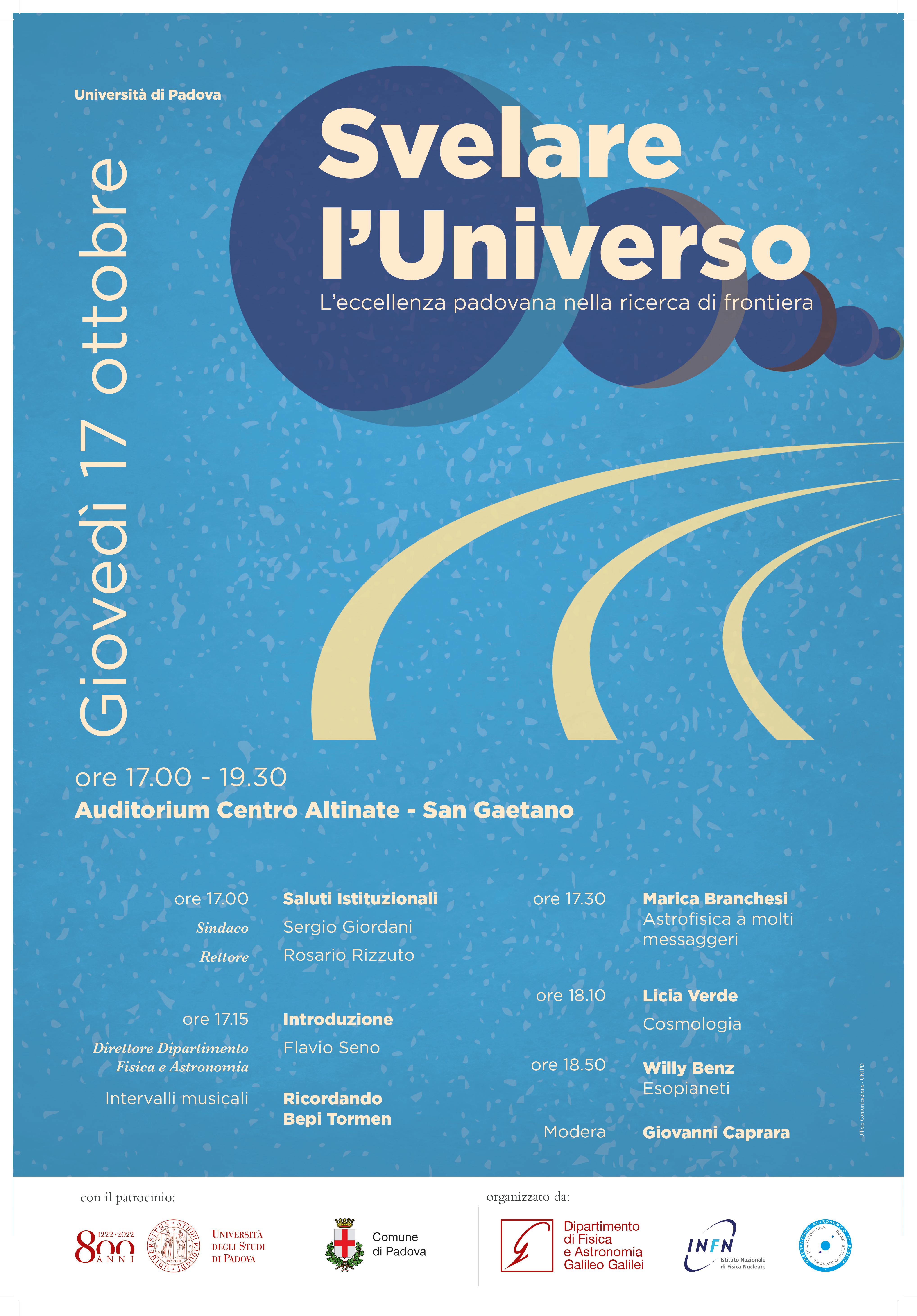 L’incontro è stato organizzato dal Dipartimento di Fisica e Astronomia (DFA) dell’Università di Padova che è stato selezionato tra i Dipartimenti di Eccellenza delle Università Italiane con un progetto su la “Fisica dell’Universo”. Al progetto partecipano anche le sezioni patavine dell’Istituto Nazionale di Fisica Nucleare (INFN) e dell’Istituto Nazionale di Astrofisica (INAF). Le ricadute di questo progetto anche sulla città di Padova saranno significative. Proprio per questo, per presentare alla città, ai politici, agli imprenditori e ai cittadini in generale il progetto e le sue prospettive, abbiamo pensato all’incontro pubblico, organizzato nell’agile forma della discussione: i tre relatori di rilevanza internazionale hanno presentato in modo accattivante e comprensibile alcune delle attuali frontiere della ricerca in fisica dell’Universo discutendone con tre docenti del DFA. Ad animare il dibattito ci sarà Giovanni Caprara, noto giornalista scientifico del Corriere della Sera.